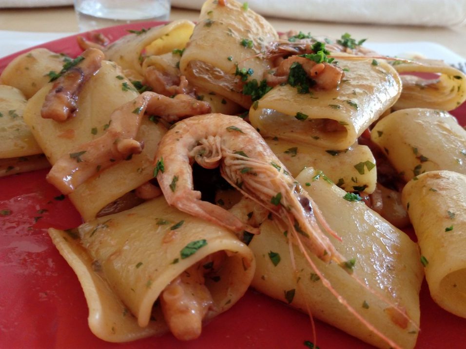 Chef Casareccio Gabriele Massari Ingredienti (per 2 Persone) 220gr Paccheri 2-3 Moscardini Medi (oppure 8-10 piccoli) 300gr Gamberi 8-10 Pomodori Datterino 2 Spicchi di Aglio 1 Peperoncino Secco 1/2 Bicchiere Vino (per sfumare) Prezzemolo Fresco Cominciamo con il pulire i…