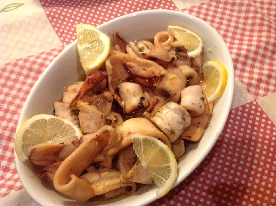 Tagliare i calamari a strisce, in modo che quando cuociono si arrotolano, metterli in un tegame con 4 cucchiai di olio extra vergine, 2 spicchi di aglio, sale di Maldon, pepe e peperoncino, rosolare bene, aggiungere un bicchiere di vino bianco, cuocere a fuoco vivo fino a quando il vino è tutto evaporato, in ultimo aggiungere la scorza di un limone grattugiato.